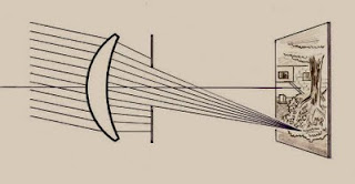 A meniscus lens forming an image of a scene on a flat surface. Note that the picture projected by the lens is inverted. |